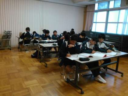 サッカー部は多目的室にて学習会。学力向上目指します。