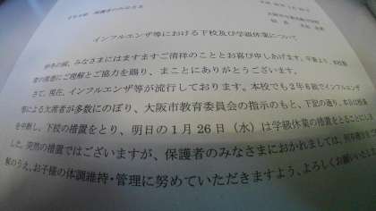 平成30年1月26日(金)を「学級休業」とします。