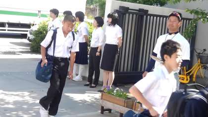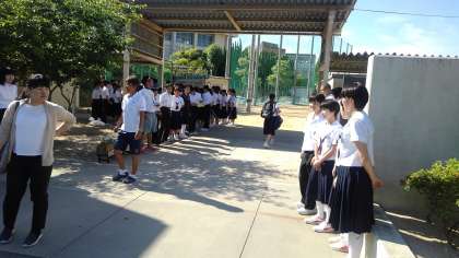 生徒、先生がたくさん立っています。