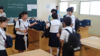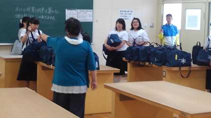 3階被服室に荷物を置きます。