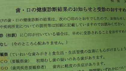 歯・口の健康診断結果が配布されました。