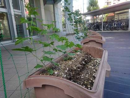 アサガオやゴーヤなどのつる性植物を窓際に這わせて作る、自然のカーテンです。