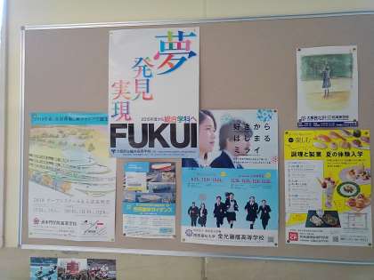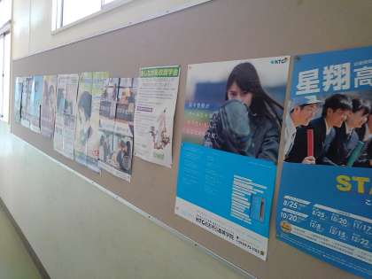 3年生廊下の掲示板にたくさんの高等学校広告ポスターが掲示されています。