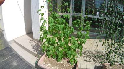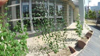 夏の暑さ対策の一つ。室内の温度上昇を防ぐために、建物の壁や窓、窓周辺の地面を直射日光から遮るように、つる性植物を繁茂させるものです。