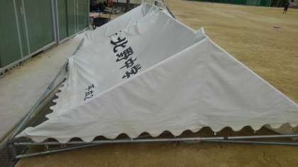妨球ネット、テントの脚をたたんでいます。