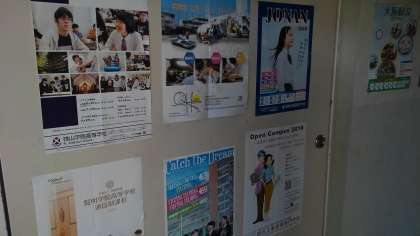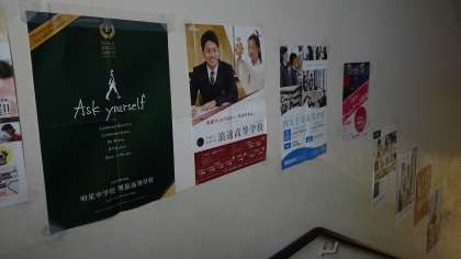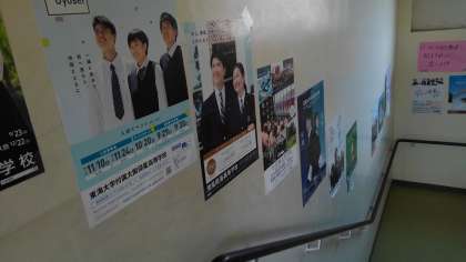 3年生廊下、A階段2階付近にたくさんの高校ポスターが掲示されています。