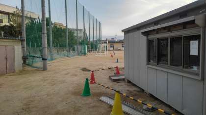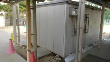 また、(写真上)台風で90度回転して、通用門からグランドへの通路を遮断していた倉庫が(写真下)もとの位置に戻りました。