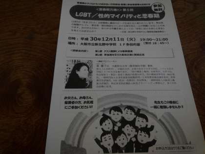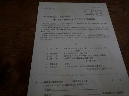 本日お手紙を配布させていただいておりますが、PTA人権啓発活動委員会では思春期真っ只中の子育てについてみなさんで考えていく、第5回「思春期万歳!!LGBT/性的マイノリティと思春期」の講演会と意見交換の会を開催いたします。