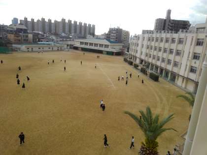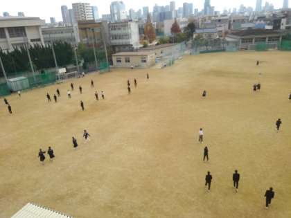 約100人ぐらいの生徒が楽しくバレーボールを使って楽しんでいます。