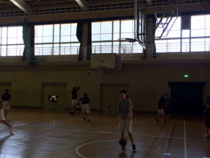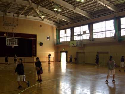 体育館3分割の前半は女子バスケットボール部です。練習時間よりも前に来て自主練習を行っている生徒もいます。そういった向上心を持って日々頑張っています。
