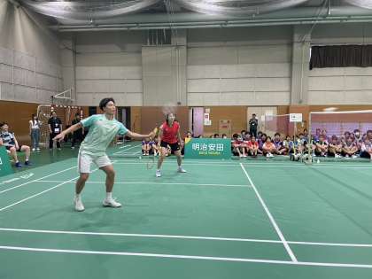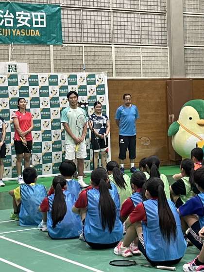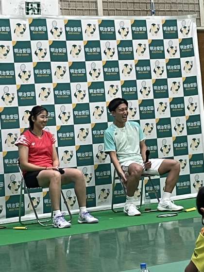 ゲスト講師に、世界選手権等で数々のメダルを獲得した桃田賢斗選手も参加されており、生徒たちは興奮状態で指導を受けていました。