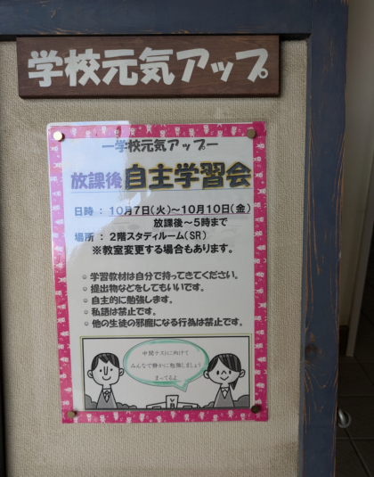 本日より中間テスト1週間前になりますので、学校元気アップ事業主催の自主学習会がスタートしました。皆さん真剣に取り組んでいます。ボランティアスタッフの皆様よろしくお願いいたします。
