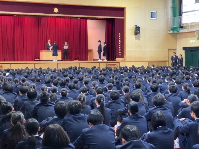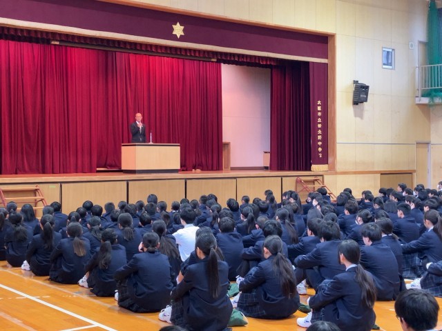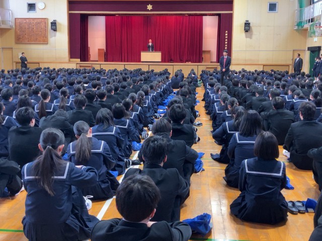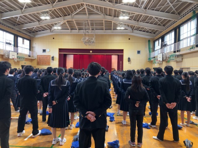さて、本日は体育館で始業式を行いました。3学期から新しく来られた講師の先生の紹介もありました。