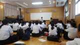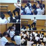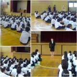 写真上 教育実習生の講話です。 写真下 竹下先生の講話です。