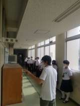 教室前の廊下では視力検査を行いました。 感染症予防のために斜眼器を使用後だけでな...