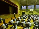 男子バドミントン部、男子バレーボール部、女子バレーボール部の表彰を全校集会で行い...