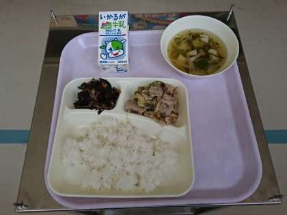 今日の給食献立は「豚肉のごまだれ焼き」です。