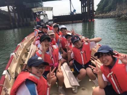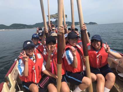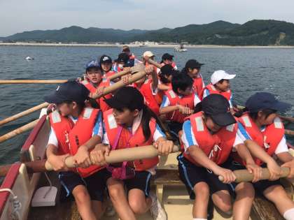 海に出て、みんなで呼吸を合わせて櫂を漕いでます。