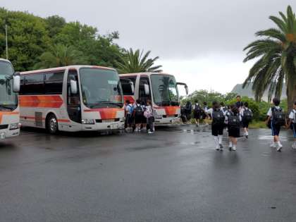 4時10分に学校到着予定ですが、交通事情により前後します。
