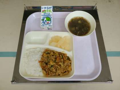 今日の給食献立は「和風カレー丼」「もずくとオクラのとろり汁」です。