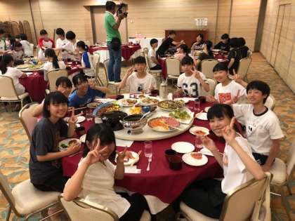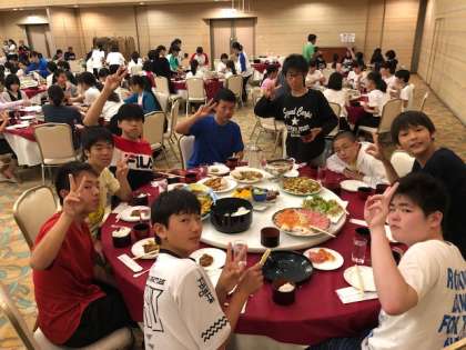 体験活動、ラフティングと体力を使ったので、みんなで取り分けてくたくさん食べました。