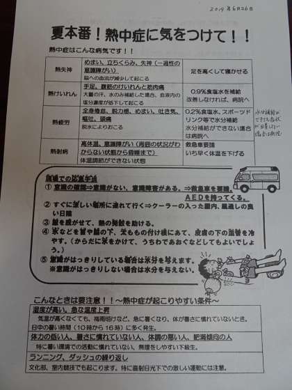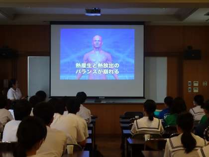 熱中症になるとどうなるか、熱中症になった人が出たらどうするかなど、丁寧に教わり、生徒たちは真剣に聞いていました。