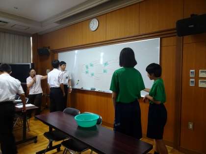夏本番になる前に、部活動の部長・副部長が多目的室に集まり、保健室の先生から熱中症予防の講習をしてもらいました。