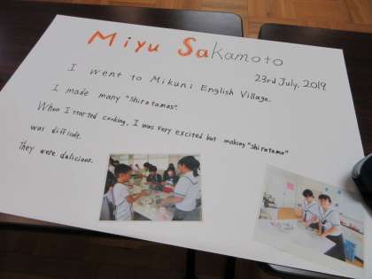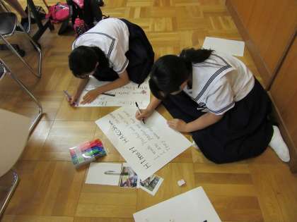 昨日の復習のため、料理の動作や単語が入ったDVDを鑑賞後、明日の発表会用のポスターを作りました。