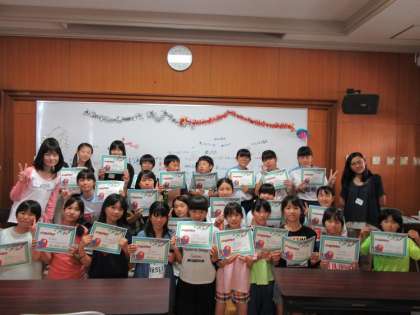 1日目のクッキングの感想を英語で発表した後、2チーム対抗で、英語カルタ、伝言ゲーム、ラケットレース、魚つりゲームなどをしました。勝ったチームから順にプレゼントを受け取りました。その後、それぞれ感想文を書いて、終了証をもらいました。
