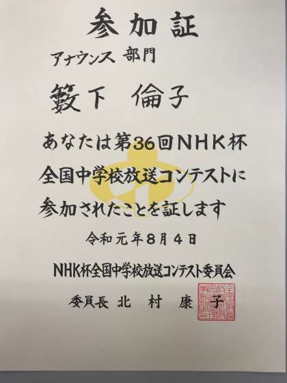 3年生の籔下さんが、アナウンス審査、CD審査を経て、第36回NHK全国中学校放送コンテストのアナウンス部門で大阪府代表として決勝進出を決めました。8月16日に、東京の千代田放送会館で全国大会決勝が行われます。