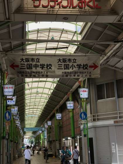 三国駅方面、東三国駅方面から三国商店街へ入ると、下の写真のような掲示がかかっていますので、そこで曲がって細い道を進むと、正門に着きます。