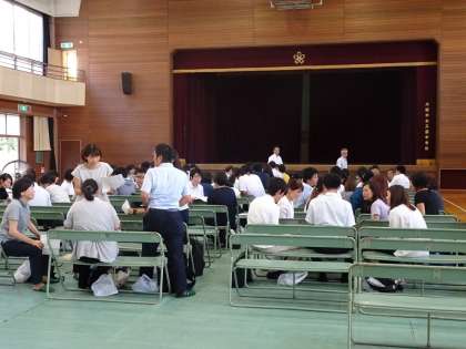 「国語」の研究発表会では、「主体的・対話的で深い学び」をテーマに、参加した国語の先生が実際にグループワークをして、話し合い、発表する体験をしながら学びました。