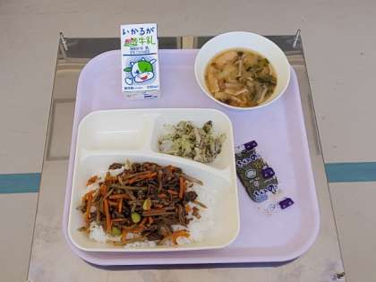 今日の給食の献立は、「牛肉のきんぴらちらし」です。
