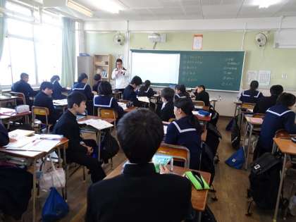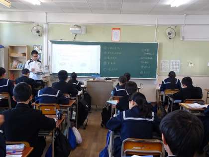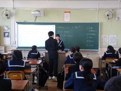 「Whose」を使って、簡単な短い対話をする練習をしました。スクリーン投影したデジタル教科書を見ながら音読をした後、本文とポイントを理解しました。次にリスニング後2人1組での対話練習、集めた文房具を使った練習をしました。
