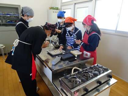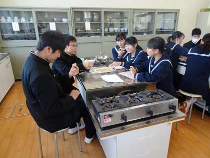 調理実習で沖縄の銘菓「ちんすこう」の調理実習をしました。最初にスクリーンで「ちんすこう」のつくりかたの動画を観て、ポイントや注意点を確認しました。それからタブレットの動画で作り方を確認しながら調理しました。班ごとに特色があっておいしくいただきました。