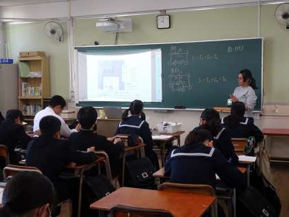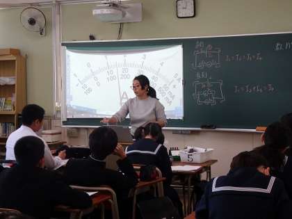 「電流計の使い方」の復習の単元で、デジタル教科書を使って、スクリーンに投影し、電流計の使い方の動画や目盛りをアップしたりして、説明や問題練習をしました。