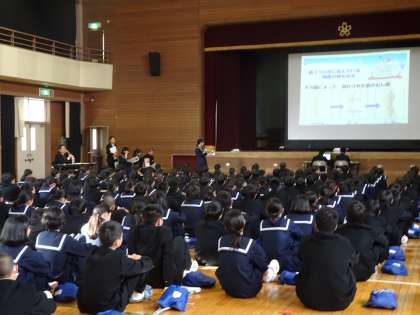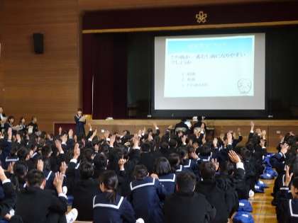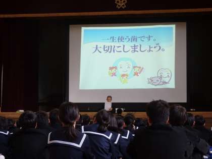 学校歯科医の田中学先生に来ていただき、保健委員による事前アンケートのまとめと歯に関するクイズと、田中先生の講話を行いました。