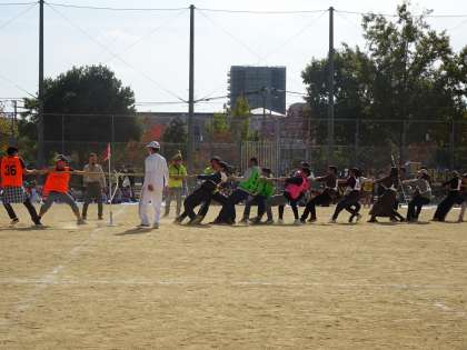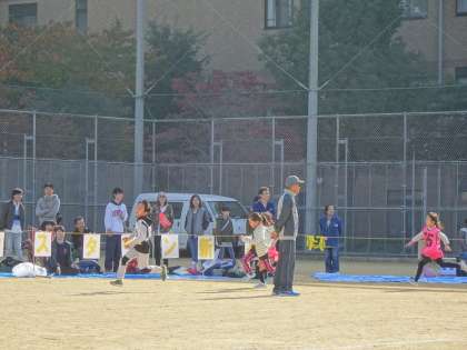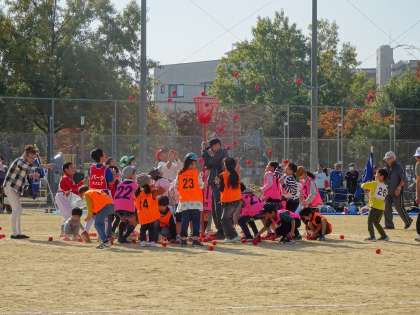 晴天の下新高地域運動会が新高中央公園グラウンドで行われています。地域の幅広い年齢層の方がいっしょになって楽しいひとときを過ごしておられました。