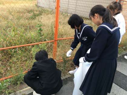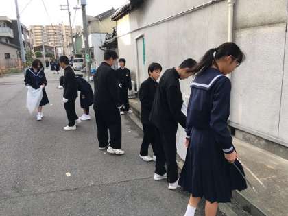 地域の公園や通学路の美化につとめ、社会奉仕の精神を養うことを目的に行っています。限られた時間ですが、清掃活動に参加した生徒たちは、道路の隅々までゴミ拾いを行ってくれました。