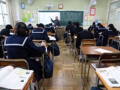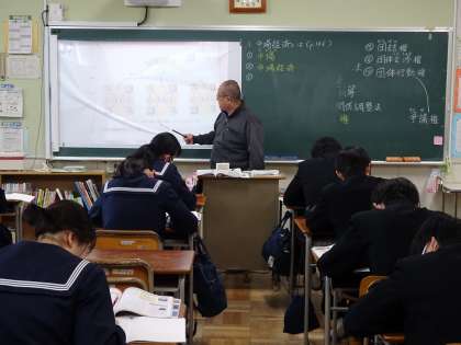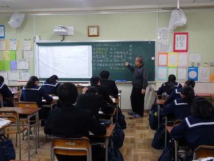 「働く人の権利と保護」の単元の学習です。書画カメラを使って、教科書や資料集の必要な部分をスクリーンに映しながら、ワークシートを使って労働者の保護や権利について復習しました。