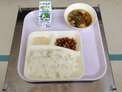 今日の給食の献立は、「鶏肉と野菜の煮もの」「かぶのゆず風味」です。
