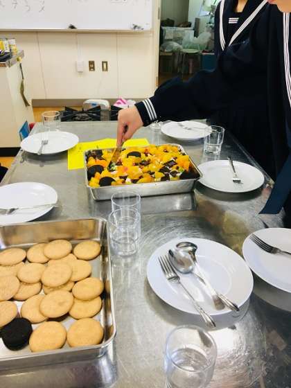 英語で作り方を説明しながらスコップケーキ(Trifle)を作って食べました。その後、文化祭で作った「的あて」(Hit a target)、「輪投げ」(Ring Toss Game)や英語のしりとりなどのゲームをしました。最後に英単語のビンゴをして”Bingo"になった部員からクリスマスプレゼントを受け取りました。