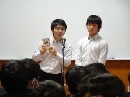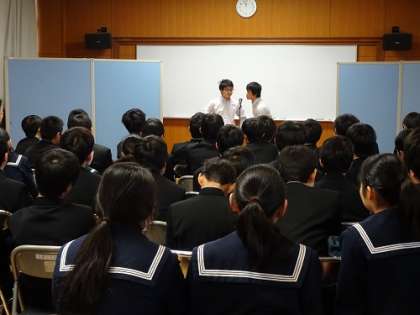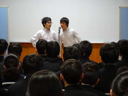 書評漫才グランプリに出場した3年生2人のコンビが、放課後に多目的室で演技を披露しました。集まった先生・生徒の前で、実力を発揮し、大きな笑いをとっていました。