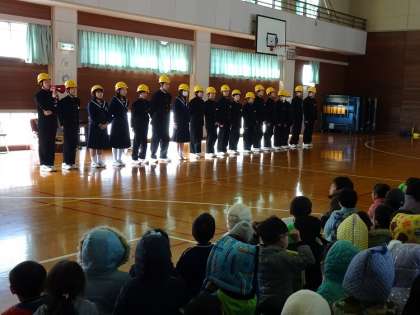 今日は、1・2年生の防災リーダーが、通り道に立ち、園児たちの避難の誘導をしました。体育館2階に集合した後、防災リーダーのメンバーが紹介され、卒園生の生徒代表が園児に話をしました。