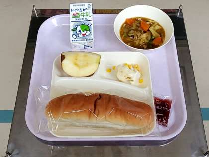 今日の給食の献立は、「豚肉と野菜のカレー煮」「カリフラワーとコーンのサラダ」です。