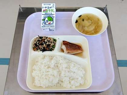 今日の給食の献立は「あかうおのしょうゆだれかけ」「うすくず汁」です。