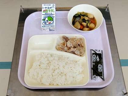 今日の給食の献立は「鶏肉のからあげ」「まる天と野菜のうま煮」です。