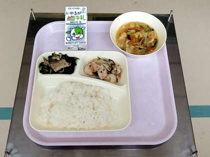 今日の給食の献立は「鶏肉のゆず塩焼き」「こまつなの煮びたし」です。