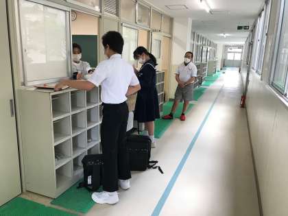 中段:3年生は、教室前の廊下で説明を受けながら、提出と受け取りをしました。