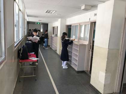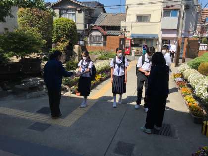今日は、1年生の登校日です。朝、正門で出迎えて消毒、検温の確認をした後、教室まで行って、廊下などで課題の提出や配布物の受け取りを行いました。